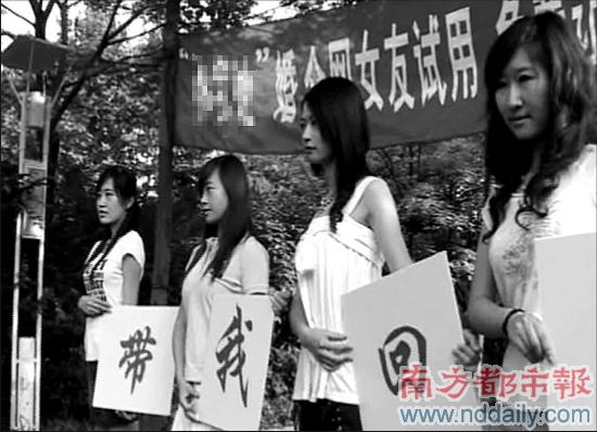 帖子稱:當天在廣州珠江公園和朋友閑逛,碰到一件極其雷人的事情———某婚介所在公園搞‘女友試用’活動,聲稱只要符合相關(guān)要求,就可以把現(xiàn)場的美女免費帶回家。要求如下:有車有房,資產(chǎn)過百萬,月收兩萬起。除此之外,告示牌上聲稱,本活動提供三天包退,終身包換的承諾……