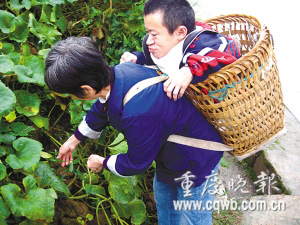 昨日上午,天空飄著細(xì)雨。巴南區(qū)南彭鎮(zhèn)鴛鴦村一條泥濘的鄉(xiāng)間小路上,一位身穿藍(lán)色外套、腳穿解放鞋,身體瘦弱的老婦人,背著一個(gè)小背篼,背篼里裝著一個(gè)面相30多歲、身高只有幾十厘米的男子,緩慢地走在路上。