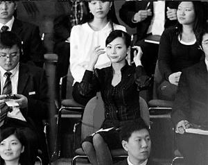 11月16日13時(shí),對中國進(jìn)行國事訪問的美國總統(tǒng)奧巴馬走進(jìn)上?萍拣^會(huì)場,與中國青年展開對話。但是和奧巴馬的演講相比,現(xiàn)場攝影記者對一名黑衣女子表現(xiàn)出了更大的興趣。這名美女在現(xiàn)場脫掉紅色外套露出黑色套裝的全過程被記者用相機(jī)記錄下來,被制作成GIF動(dòng)畫上傳網(wǎng)絡(luò),隨后這組動(dòng)畫在網(wǎng)上論壇以及QQ群里廣泛傳播,隨后又有網(wǎng)友將奧巴馬演講視頻中有關(guān)該女子的片段截圖上傳,黑衣美女的美貌和氣質(zhì)迅速傾倒眾人。