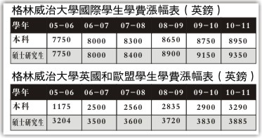 位于倫敦東南的格林威治大學(xué)是一所擁有較多中國留學(xué)生的學(xué)校,過去8年每年大陸留學(xué)生都在千人以上。該校收費歷來屬于中等偏下,2009年國際學(xué)生的學(xué)費是本科每年8750鎊,而研究生則是9150鎊。今年9月起新學(xué)年的費用略有調(diào)整,本科要8950鎊,碩士研究生需要9350鎊,只比前一年增加200鎊。