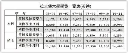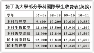 諾丁漢大學(xué)位于英國中部。由于近幾年與中國多所院校合作辦學(xué),中國留學(xué)生成批涌進(jìn)這所大學(xué);同時該校還在浙江寧波設(shè)立分校,有條件的大三學(xué)生會到英國讀書一年。記者聯(lián)系到該校的碩士研究生陳兵同學(xué),他詳細(xì)列出該校歷年來的收費標(biāo)準(zhǔn)。今年的學(xué)費比去年略有上漲,但增長率與往年持平。他覺得這個上調(diào)的價格是合理的,中國來的同學(xué)都能接受。
