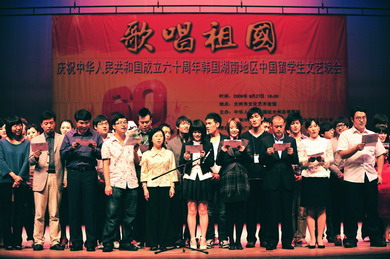 中新網(wǎng)9月28日電 據(jù)外交部網(wǎng)站報(bào)道,9月27日傍晚,來(lái)自光州市、全羅南道、全羅北道共11所大學(xué)的700名中國(guó)留學(xué)生在此歡聚一堂,參加由駐光州總領(lǐng)館和在韓中國(guó)留學(xué)生聯(lián)合會(huì)光州全南分會(huì)、全北分會(huì)聯(lián)合舉辦的“歌唱祖國(guó)——慶祝建國(guó)60周年韓國(guó)湖南地區(qū)中國(guó)留學(xué)生文藝晚會(huì)”。