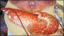 我們接受了店長(zhǎng)的建議,從鎮(zhèn)上的小店買來(lái)面包和飲料回來(lái),待我們歸來(lái),位子也正好等到了,拼桌!看著菜單上豐富誘人的海鮮,我早已等不及了, 點(diǎn)了這里的招牌菜:兩人份海鮮拼盤(9.5磅每人),其中包括, 美味大蟹,深黃粉紅對(duì)蝦, 多汁鳥(niǎo)蛤(海扇),腌熏三文魚(yú),對(duì)蝦,鯡魚(yú),煙熏馬加魚(yú),蚌和綠蚌貝,另外我們還點(diǎn)了大龍蝦,奶油蒸歐洲蠔(只有9月和4月之間可以吃到)和蔬菜沙拉。品嘗海鮮最好配以檸檬,芥末,醋,壽司醬油,和辣椒醬。 店內(nèi)提供檸檬,塔巴斯哥辣醬油和醋,如果你還想要什么配料,可以在小鎮(zhèn)的店上找到。