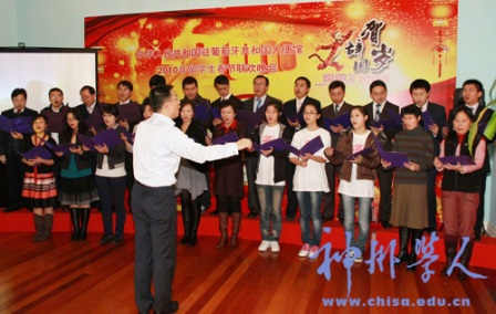 隨后,聯(lián)歡晚會(huì)在《我和我的祖國(guó)》的歌聲中拉開(kāi)了序幕。留學(xué)生們和使館工作人員獻(xiàn)上了形式多樣的節(jié)目:舞蹈《蒙古舞》、《金梭和銀梭》,小品《吃面》、《賣(mài)拐》,男聲獨(dú)唱《故鄉(xiāng)的云》,女聲獨(dú)唱《父老鄉(xiāng)親》,配樂(lè)詩(shī)朗誦《致橡樹(shù)》等等。精彩紛呈的表演時(shí)時(shí)引來(lái)熱烈的掌聲和喝彩聲,會(huì)場(chǎng)上始終洋溢著歡樂(lè)祥和的節(jié)日氣氛。