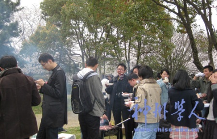 正午時分,同學(xué)們又回到賞花的大本營-----大濠公園櫻花樹下!皟(yōu)しい”的學(xué)友會負責(zé)人員已經(jīng)為大家準(zhǔn)備好了烤肉用的器具以及各種飲料。大家自覺地分成三、五人一組,圍著燒烤架邊聊天邊開始品嘗自己動手制作的美食。