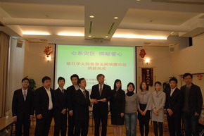 中新網(wǎng)4月21日電 據(jù)《日本新華僑報(bào)》報(bào)道,青海玉樹地區(qū)發(fā)生7.1級(jí)強(qiáng)烈地震后,廣大留日學(xué)人通過各種媒體密切關(guān)注抗震救災(zāi)情況、關(guān)注災(zāi)區(qū)的同胞命運(yùn)。4月18日上午,全日本中國(guó)留學(xué)生學(xué)友會(huì)會(huì)長(zhǎng)胡昂以及東京大學(xué)、東京工業(yè)大學(xué)、筑波大學(xué)、早稻田大學(xué)、慶應(yīng)大學(xué)、東京海洋大學(xué)、千葉大學(xué)、日本大學(xué)等8所大學(xué)的中國(guó)留學(xué)生學(xué)友會(huì)會(huì)長(zhǎng)來到教育處,將留日學(xué)子為青海省玉樹地震災(zāi)區(qū)募集的第一批賑災(zāi)款60萬日元送到了教育處。中國(guó)駐日本大使館公使銜參贊孫建明代表教育處接受了來自留日學(xué)子的第一筆愛心捐款。