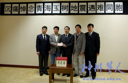 2010年4月21日上午,在韓中國(guó)留學(xué)生會(huì)會(huì)長(zhǎng)李忠輝等代表全體留學(xué)學(xué)人向地震災(zāi)區(qū)捐款,駐韓中國(guó)大使館張?chǎng)紊笫菇邮芰肆魧W(xué)生的自愿愛心捐款。