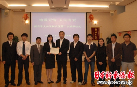中新網(wǎng)那個5月28日電 據(jù)日本新華僑報網(wǎng)報道,5月25日上午,全日本中國留學(xué)生學(xué)友會副會長韓冰以及東京大學(xué)、東京工業(yè)大學(xué)、早稻田大學(xué)、埼玉大學(xué)、東京海洋大學(xué)、千葉大學(xué)、日本大學(xué)等7所大學(xué)的中國留學(xué)生學(xué)友會會長和代表來到教育處,將留日學(xué)子為青海省玉樹地震災(zāi)區(qū)募集的第二批賑災(zāi)款送到了教育處。第二批捐款總計日幣2,861,295元、人民幣1,000元。孫建明公使銜參贊代表教育處接受了來自留日學(xué)子的第二筆愛心捐款。