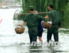 圖:武警戰(zhàn)士護送淮河災(zāi)民返鄉(xiāng)