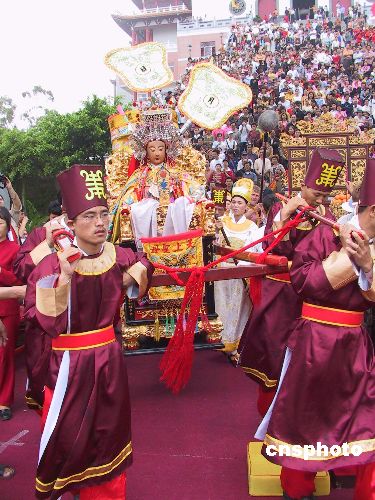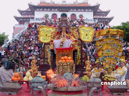 在海內(nèi)外擁有兩億多信眾的媽祖金身,是日巡游福建莆田湄洲島,數(shù)萬(wàn)信徒前來(lái)祭拜。作者:王東明
