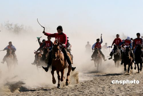 | 9月28日,來自各鄉(xiāng)鎮(zhèn)的200多名牧民在新疆哈巴河縣首屆金秋樺林藝術(shù)節(jié)上舉行賽馬比賽。在新疆維吾爾自治區(qū)成立50周年之際,哈巴河廣邀在該縣投資的企業(yè)界等相關(guān)人士參加阿肯彈唱、姑娘追等富有民族特色表演的藝術(shù)節(jié),以此拉動(dòng)當(dāng)?shù)亟?jīng)濟(jì),凝聚人心,打造哈巴河工業(yè)興縣新形象。作者:金煒