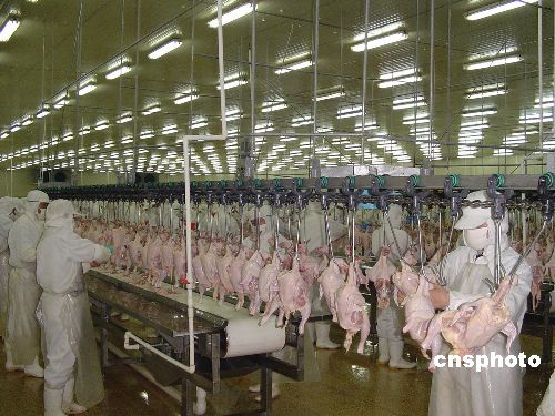 | 十一月十九日,閩北光澤縣圣農(nóng)集團(tuán)有限公司的員工在屠宰車(chē)間消毒,防堵禽流感。圣農(nóng)集團(tuán)有限公司是中國(guó)內(nèi)地現(xiàn)代化程度最高的集種雞飼養(yǎng)、苗雞孵化、肉雞飼養(yǎng)、屠宰加工、食品深加工為一體的聯(lián)合型白羽肉雞生產(chǎn)食品加工企業(yè),為保證雞肉食品的安全,該公司采取了一系列嚴(yán)格消毒措施。作者:陳國(guó)明
