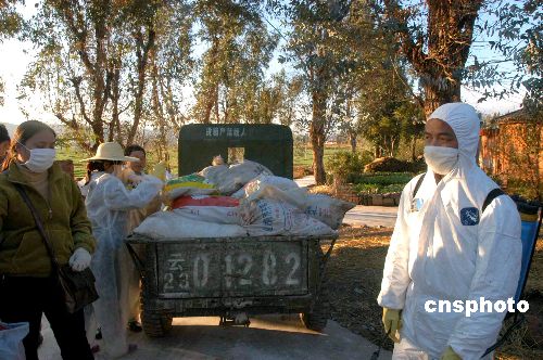 | 十一月二十三日下午,防疫人員用拖拉機(jī)把云南省楚雄市富民鎮(zhèn)荷花村被撲殺的家禽運(yùn)走,進(jìn)行集中處理,杜絕傳染隱患。中國(guó)農(nóng)業(yè)部二十二日稱,云南省楚雄市富民鎮(zhèn)荷花村發(fā)生高致病性禽流感。當(dāng)?shù)卣M織人員對(duì)疫區(qū)點(diǎn)三公里范圍內(nèi)撲殺家禽。作者:甘娜