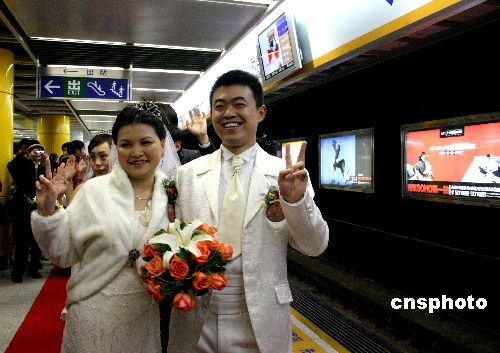 2006年元旦,一場(chǎng)浪漫的“幸福時(shí)光——全國(guó)首次地鐵集體婚禮”在南京舉行,六對(duì)新人乘上“開(kāi)往愛(ài)情的地鐵” ,參加永生難忘的集體婚禮。新人及親屬登上一節(jié)專門(mén)布置的喜慶地鐵婚車(chē),向同車(chē)乘客散發(fā)喜糖,接受祝福。作者:阿董