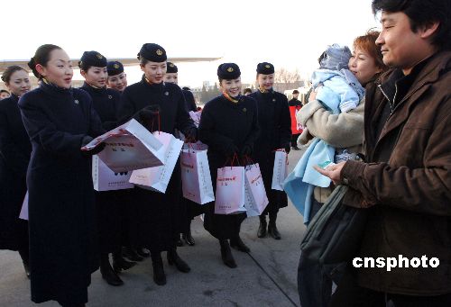 | 1月25日上午,國航“奧運號”CA197航班和海航“快樂海浪”HU7965航班先后由首都機(jī)場起飛,共運載了230多位臺胞前往臺北。國務(wù)院臺辦副主任李炳才、民航總局副局長楊國慶、北京市副市長張茅、中航集團(tuán)總裁李家祥等分別向每一位乘客握手道別,并送上特別精美的"福娃"、“奧運號”彩繪機(jī)模型和“年年有魚”年糕等禮品。作者:馬儒壯