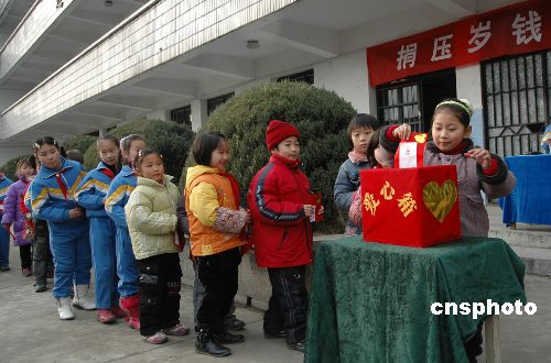 | 2006年2月22日,安徽巢湖東風(fēng)路小學(xué)西校區(qū)一年級學(xué)生正在捐獻壓歲錢。據(jù)了解,該學(xué)校自1994年以來,連續(xù)12年不間斷開展“捐壓歲錢 助同齡人”獻愛心活動,捐款數(shù)額達10余萬元,分別用于資助該校特困生、農(nóng)村失學(xué)兒童、“手拉手”結(jié)對少先隊員及“春蕾計劃”失學(xué)女童、援建全國第二所“手拉手”希望小學(xué)等活動,受到中國青少年發(fā)展基金會表彰。作者:蘇玲