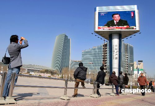 | 3月14日上午,北京路人在街頭大型電視屏幕前駐足觀看溫家寶總理正在舉行的記者會。當(dāng)天上午中國十屆人大四次會議閉幕后,中國總理溫家寶在北京人民大會堂舉行記者招待會闡述中國的內(nèi)外政策,受到北京市民的關(guān)注。北京許多公眾場所的電視進(jìn)行了直播,中關(guān)村廣場藍(lán)天下的大彩屏吸引過往行人。作者:廖攀