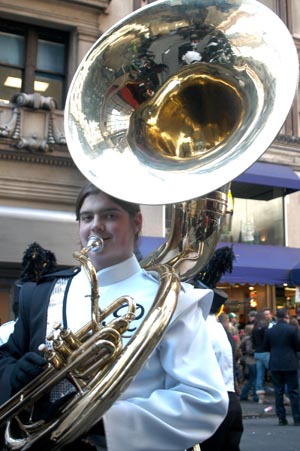 頗具特色的風(fēng)笛演奏。作者:譚宏偉 游行隊伍中的女樂手。作者:譚宏偉