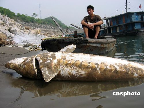 | 4月18上午,幾名漁民在湖北宜昌市葛洲壩下紫陽江段發(fā)現(xiàn)一條死亡的中華鱘,據(jù)趕到現(xiàn)場的宜昌漁政部門技術(shù)人員初步鑒定,中華鱘為輪船螺旋槳擊打后死亡。該中華鱘長約3.3米,重為250公斤左右,對該中華鱘的具體死亡情況,技術(shù)人員表示要作進(jìn)一步的研究。作者:劉曙松