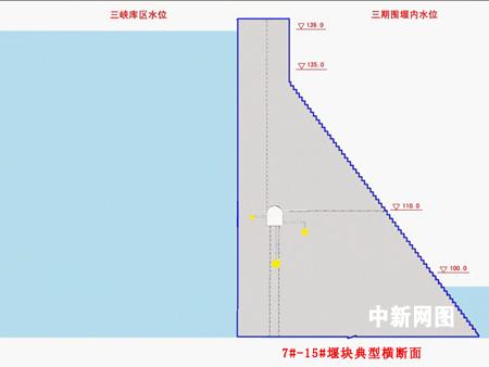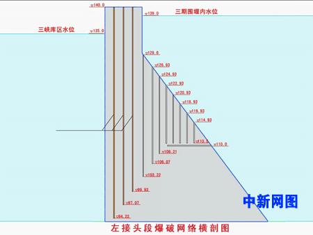 今日將要拆除的三期RCC圍堰工程,圍堰為Ⅰ級臨時擋水建筑物,平行于三峽大壩布置,全長約五百八十米,堰頂高程一百四十米,頂寬八米,最大堰高一百一十五米。