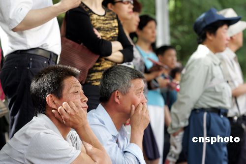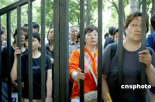 北京考生家長們聚集在第四中學(xué)考點(diǎn)外焦急地等待著應(yīng)考的學(xué)子。中新社發(fā) 張勤 攝