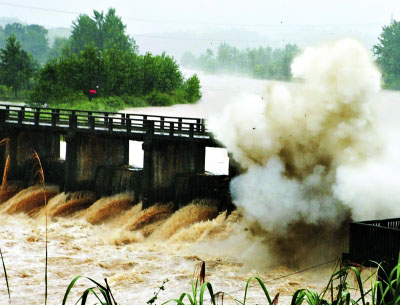 當(dāng)日,咸寧市咸安區(qū)馬橋鎮(zhèn)高賽水電站的攔水壩實(shí)施爆破泄洪。受強(qiáng)降雨影響,咸寧市南川水庫水位超過警戒線,水庫下游至馬橋鎮(zhèn)高賽水電站間部分地區(qū)出現(xiàn)內(nèi)澇。咸安區(qū)防汛指揮部決定爆破高賽水電站的部分?jǐn)r水壩,確保南川水庫及時(shí)泄洪。新華社發(fā)(鄧東峰攝)