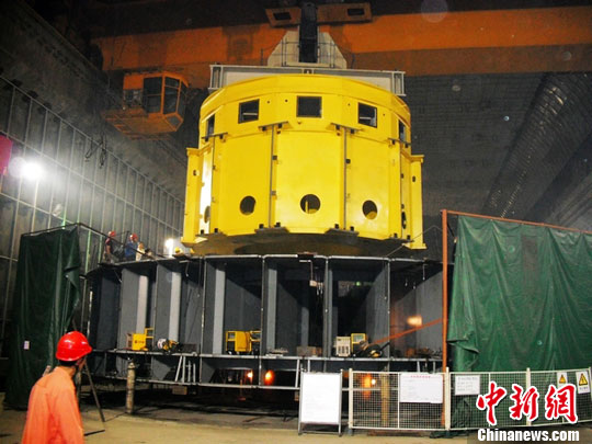 中新網(wǎng)宜昌8月7日電 (上官純青 高松)7日下午,三峽地下電站在建的6臺(tái)70萬千瓦發(fā)電機(jī)組第一臺(tái)轉(zhuǎn)子中心體運(yùn)抵廠房進(jìn)行了安裝。