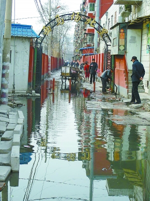 據(jù)居民介紹,西馬場北里只有這一條東西走向的胡同,居民出門、購物都必須走這條路?涩F(xiàn)在路面每天汩汩往外冒臭水,人們只好用方磚沿著胡同北面鋪了一條窄路勉強通行,而現(xiàn)在那些方磚也被臭水淹沒了,居民通行更加困難。