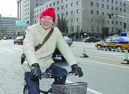 看記者正在拍照,讓他配合一下,他咧嘴笑了,然后騎上車離開了。離開前,記者說,您出行很環(huán)保。∷_玩笑說,就算低碳一次吧。(記者 郭靜)