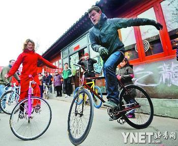 只能通過一輛小轎車的五道營胡同,幾十名“老外”耍起車技,昨天(7日)下午,來自美國、德國、英國、法國等十六個國家的五十余名外國朋友用自行車表演,與“胡同鄰居”共同倡導(dǎo)“綠色出行、低碳生活”主題。
