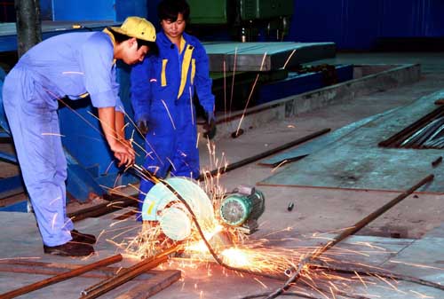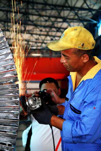 一名工人在師父的指導(dǎo)下切割鋼材。 中新社 馮昕 攝 一名工人在打磨設(shè)備。 中新社 馮昕 攝