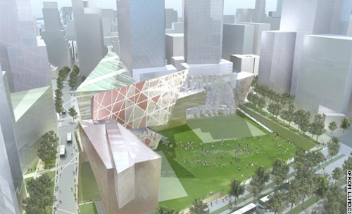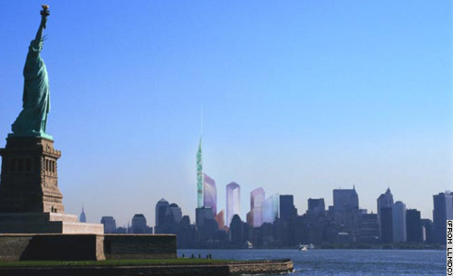2003年2月27日,丹尼爾·利伯斯金的“紀(jì)念地基”設(shè)計(jì)方案被選中。該方案的亮點(diǎn)是一棟高達(dá)1776英尺的辦公大廈,大廈的地下空間被用于建造紀(jì)念館。這個(gè)方案后被人們稱作“自由之塔”。
