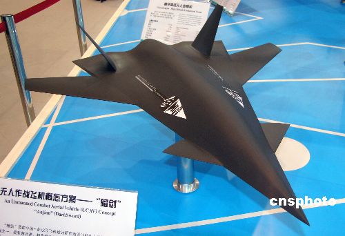 中國(guó)航空工業(yè)第一集團(tuán)公司首次展示無(wú)人作戰(zhàn)飛機(jī)概念方案“暗劍”模型,最受觀眾矚目。