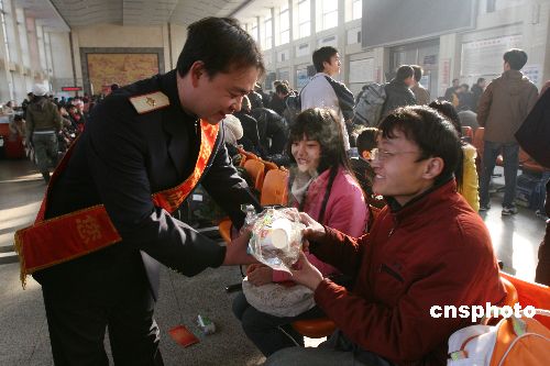 開(kāi)封火車(chē)站團(tuán)委組織青年志愿者來(lái)到候車(chē)室、站臺(tái)等處,免費(fèi)向過(guò)往旅客送水、提供咨詢、搬運(yùn)行李,并進(jìn)行春運(yùn)安全宣傳等服務(wù)。中新社發(fā) 凱楓 攝