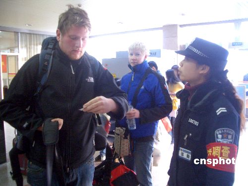 桂林車(chē)站派出所民警在候車(chē)室用英語(yǔ)與外國(guó)旅客交流,解答問(wèn)題。中新社發(fā) 雷明華 攝