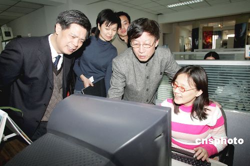圖為中新社總編輯郭招金(右一)陪同他參觀該社主辦的中國(guó)新聞網(wǎng)(簡(jiǎn)稱“中新網(wǎng)”)。