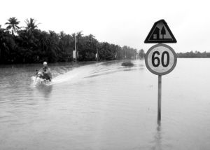 瓊海嘉積鎮(zhèn)多條道路遭受內(nèi)澇。17日下午2時許,南國都市報(bào)記者徒步趟過3公里積水路段,來到上次受災(zāi)嚴(yán)重的嘉積鎮(zhèn)橋頭村委會。該村委會通往嘉積的兩條道路豪華路、嘉博路部分路段積水超過1米。如果不是路邊豎立的路燈,很難分清哪里是道路,哪里是路邊水田。