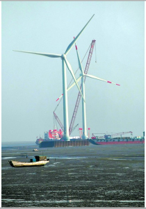 10月20日上午,隨著中國國電集團公司總工程師張宗富一聲令下,龍源江蘇如東海上(潮間帶)試驗風場首批兩臺各1.5兆瓦風力發(fā)電機組在距海岸線3公里的南通市如東縣南黃海環(huán)港外灘上緩緩啟動,電流立即匯入江蘇省電網(wǎng)。至此,中國首批海上風力發(fā)電機成功并網(wǎng)發(fā)電,中國風能由此跨入藍色海洋時代。