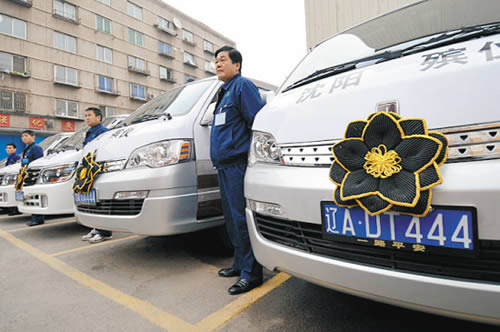 白、灰、棕三色相間的車身上有“沈陽殯儀”標(biāo)志,號牌后三位均為“444”。10月28日,沈陽市殯儀車集體換裝,在全國率先開始統(tǒng)一殯儀車標(biāo)識。年底前,全市70多輛正規(guī)殯儀車將全部“變身”換裝。