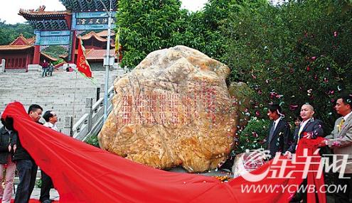 11月14日上午,廣州南沙天后文化學(xué)會第一屆理事會暨會員大會在南沙區(qū)召開。會后舉行了奇石安放儀式,一塊重達40多噸,專門從福建媽祖故里——莆田地區(qū)運來的奇石正式安放在天后宮廣場。據(jù)介紹,這塊黃臘石高3.5米,寬4.6米,厚2.2米,如此巨大的一塊天然黃臘石,極為罕見。
