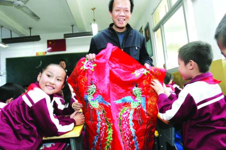 看著穿著統(tǒng)一校服的同學(xué)們,福州刺繡傳人張三忠說:“如果是在過去,七八歲孩子的衣服上會(huì)有好多花樣,花紋圖案都是繡上去的。”說著,他拿出一幅繡品,一件繡著金線鳳凰的紅色綢緞,同學(xué)們都說太好看了,都想用小手摸一摸,張先生爽快地答應(yīng)了。孩子們一個(gè)個(gè)走過去,用手觸摸有上千年歷史的福州刺繡。張先生說,此時(shí)他想到,“未來”正在感知“歷史”。
