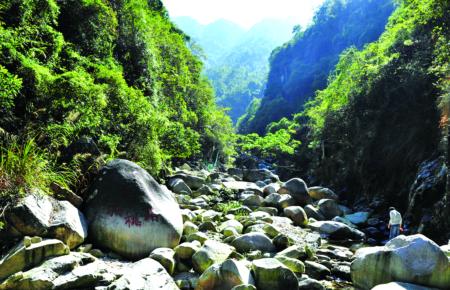 再走兩小時(shí),已是人跡罕至。遠(yuǎn)遠(yuǎn)望見(jiàn)一亂石懸崖,溪水纏繞,我們以為已到峽谷盡頭。飛踏巨石,沖到崖下,發(fā)現(xiàn)居然只是峽谷拐角———峰回路轉(zhuǎn),里面更長(zhǎng)。