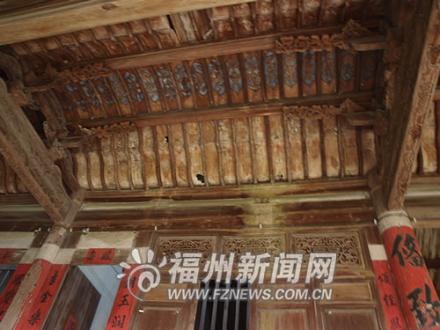 戴祥滋故居為四合院式民居,建于民國(guó)初期,系穿斗式木構(gòu)架,面闊五間,大門前有大埕,正座建有前軒廊,后院有天井和單坡頂?shù)幕乩,正厝右?cè)有附厝,左側(cè)50米處設(shè)有門樓和石構(gòu)三層碉樓各一座。記者發(fā)現(xiàn),該宅規(guī)模較大,建造裝修十分講究,屏門上方及軒廊、梁架等處均雕刻有精美的圖案,色彩明麗。