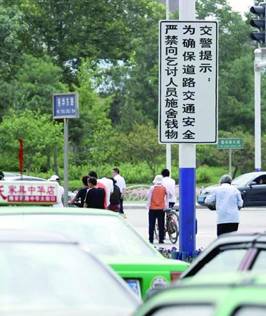 近來,在省城石家莊“迎賓大道”裕華路與建設(shè)大街交叉口,交管部門豎起的兩塊“新式”交通警示牌引發(fā)市民議論。“為確保道路交通安全,嚴(yán)禁向乞討人員施舍錢物”的警示語赫然入目,對(duì)此,記者在采訪中也聽到了社會(huì)各界的一些不同看法。