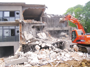 記者上午在現(xiàn)場看到,為了防止意外發(fā)生,不少執(zhí)法隊(duì)員都在現(xiàn)場待命,3輛大型挖掘機(jī)伸出鐵爪,猛地將屋面和墻壁敲碎,隨著轟隆隆的倒塌聲,兩幢豪華別墅逐步被肢解,現(xiàn)場塵土飛揚(yáng),鋼筋裸露。一些圍觀的居民感慨地說:“不簡單哪,要不是媒體介入,誰能拆掉這么牛的違建啊!”到了下午3點(diǎn)多鐘,記者發(fā)現(xiàn)兩幢豪華別墅已經(jīng)從堤壩上消失,現(xiàn)場一片狼藉。