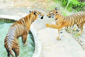 落寞的王子這下仿佛打了強(qiáng)心針一般,呼地從水里躍到了地上,和公主在虎山上嬉戲打鬧起來(lái),最終完成了好事。令見證的人們?nèi)炭〔唤氖,在此過(guò)程中百依百順的公主在完事后又大發(fā)雌威,對(duì)著仍在回味無(wú)窮的王子又是一耳光?吹解Р患胺赖膼蹅H被嚇了一跳,公主又開心地在地上打起滾來(lái),甚至讓白花花的肚皮曬起太陽(yáng)來(lái)。(記者卜瑜 通訊員李石洲攝影報(bào)道)