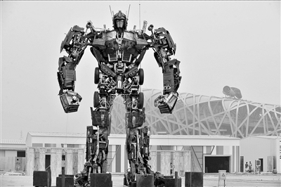 昨天上午,一座高度達(dá)到近10米、由廢舊材料拼裝成的“變形金剛”悄然現(xiàn)身于鳥巢北側(cè)廣場(chǎng)。這個(gè)大家伙來自臺(tái)灣,是目前國(guó)內(nèi)最高的變形金剛,將展出到10月10日。
