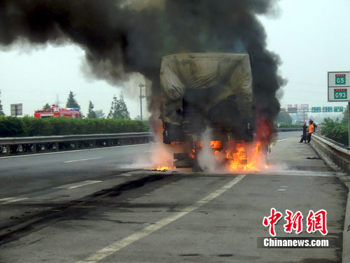中新網(wǎng)德陽8月9日電 (王超) 9日下午15時50分左右,一輛寧夏牌照的大貨車在行駛至四川成都—綿陽高速德陽黃許鎮(zhèn)路段時,車身突然起火,導致車上裝載的20余噸硝硝酸銨(化肥)猛烈燃燒,濃煙彌漫,隨時都有爆炸危險,高速公路交通一度中斷。經過德陽消防官兵緊張?zhí)幹,終將險情排除,此次受阻2個多小時的交通隨后慢慢恢復。