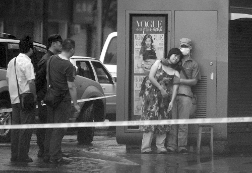 歹徒背靠書報亭,站在屋檐下,右手持刀抵住女人質(zhì)的脖子,左手牢牢拽住后者的手臂。警方隨即在現(xiàn)場拉起警戒線,為避免刺激歹徒的情緒,又及時疏散了圍觀的群眾。
