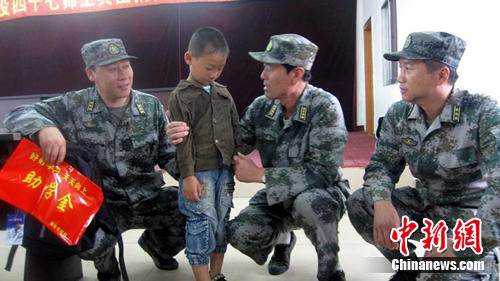 師長張寶軍說,救下男孩后,部隊忙于救人,與男孩失去聯(lián)絡。這段時間以來,張寶軍對男孩極為牽掛,他希望找到這個“光屁股”孤兒,了卻一樁心愿。8月22日上午10時,在旺起鎮(zhèn)小學,張寶軍終于見到了“光屁股”男孩張官博,他輕輕將男孩抱起,告訴他要堅強,要樂觀,要好好生活!拔視詡人的名義,一直資助你上大學,你記住爺爺?shù)脑,要堅強!睆垖氒娧劬駶櫍瑓s堅定的看著“光屁股”男孩。(完)